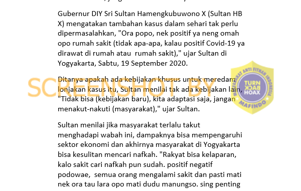 Melalui hasil penelusuran diketahui narasi tersebut berasal dari artikel berjudul “Soal Lonjakan Kasus Covid-19, Sultan HB X: Jangan Takut-Takuti Rakyat” oleh tempo.co pada tanggal 19/9/2020. Artikel tersebut membahas pernyataan Sultan HB X terkait strategi penanganan Covid-19 di Yogyakarta usai menggelar rapat perihal Covid-19 dengan bupati dan walikota se-DIY di Kompleks Kepatihan, Yogyakarta, Kamis 19/9/2020. Gugus Tugas Penanganan Covid-19 Daerah Istimewa Yogyakarta (DIY) mencatat rekor baru perkembangan Covid-19 pada Sabtu, 19/9/2020. Namun artikel terkait tidak memuat pernyataan HB X yang mengatakan “positif negatif podowae, semua orang mengalami sakit dan pasti mati nek ora tau lara opo mati dudu manungso. sing penting ono upo kanggo urip”.