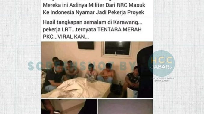 Akun Facebook Nesvita Vita atau @nesvita.vita.54 mengunggah tiga gambar yang isinya beberapa orang dalam satu kamar dan buku berwarna merah dengan logo palu arit. Dalam gambar tersebut terdapat tulisan yang berbunyi, “Penyamaran Kalian Terbongkar Sudah. Mereka ini Aslinya Dari RRC Masuk Ke Indonesia Nyamar Jadi Pekerja Proyek Hasil tangkapan semalam di Karawang… pekerja LRT….ternyata TENTARA MERAH PKC….VIRAL KAN….,” tulisan dalam tangkapan layar akun Facebook Nesvita Vita atau @nesvita.vita.54 yang diunggah pada Minggu, (31/5).