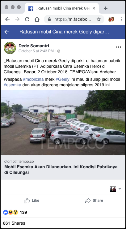 Artikel Tempo bukan tentang “di sulap jadi mobil #esemka” seperti narasi post sumber tetapi tentang “Sekarang pabrik ini hanya dijadikan gudang tempat ratusan mobil cina dengan merek Geely.”, selengkapnya di bagian PENJELASAN dan REFERENSI.