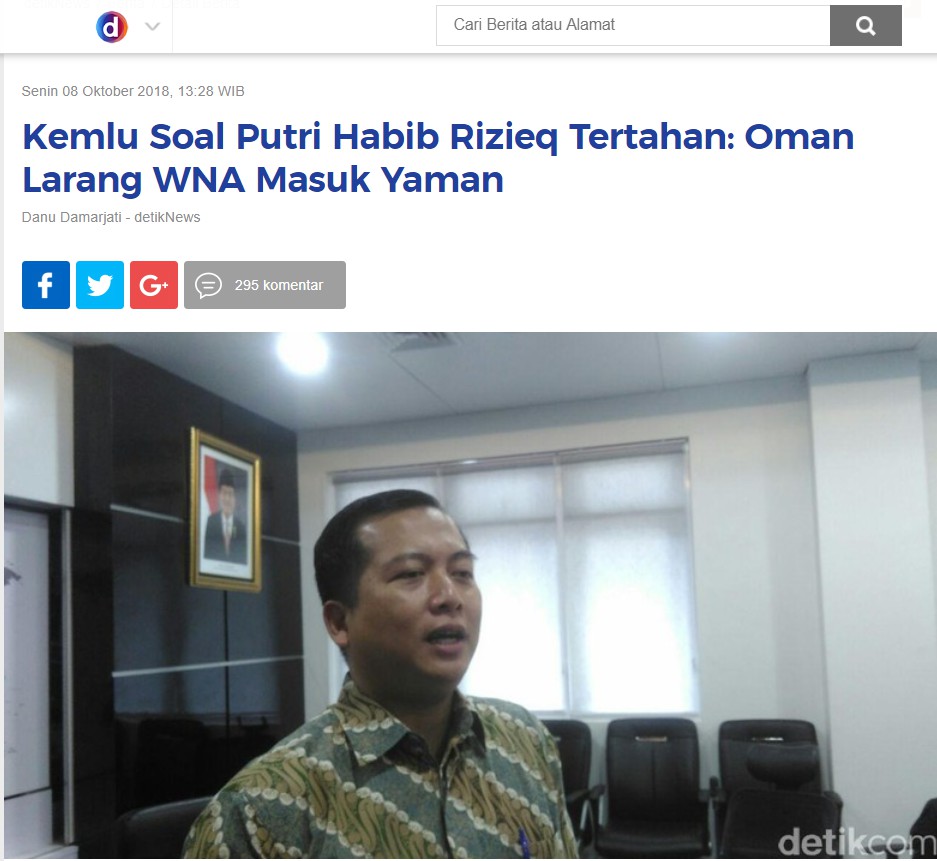 Kementerian Luar Negeri (Kemenlu) mengklarifikasi isu adanya pelarangan anak Habieb Rizieq untuk masuk ke Yaman. Dilansir dari detik.com, viva.co.id, wartaekonomi.co.id, merdeka.com, dan okezone.com, Direktur Perlindungan WNI Kemlu, Lalu Muhammad Iqbal mengatakan, larangan bagi warga negara asing keluar atau masuk perbatasan Oman dari dan ke Yaman sudah dikeluarkan Pemerintah Oman sejak Mei 2018. “Semua WNA dilarang. Yang melarang mereka menyeberang perbatasan adalah Pemerintah Oman, karena sejak Mei 2018 mereka sudah memutuskan tidak mengijinkan warga asing manapun keluar/masuk perbatasan Oman dari dan ke Yaman,” kata Iqbal.