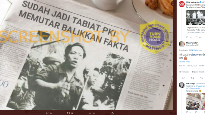 Akun Twitter Mayafarrell21 (@mayafarrell21) mengunggah cuitan berupa foto surat kabar asing dengan disertai narasi untuk membalas cuitan akun Twitter CNN Indonesia (@CNN Indonesia) tentang PKI (Partai Komunis Indonesia). Cuitan yang diunggah pada 30 September 2020 itu telah mendapat respon sebanyak 56 retweets dan 182 suka.