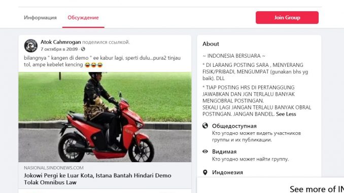 Beredar postingan dari akun Facebook Putri Atok Cahmrogan membagikan link artikel milik sindonews.com berjudul “Jokowi Pergi ke Luar Kota, Istana Bantah Hindari Demo Tolak Omnibus Law” dengan keterangan Jokowi kabur pura-pura meninjau tol pada saat demo Omnibus Law. Postingan ini diposting pada 9 Oktober 2020 dan disukai sebanyak 722 kali.
