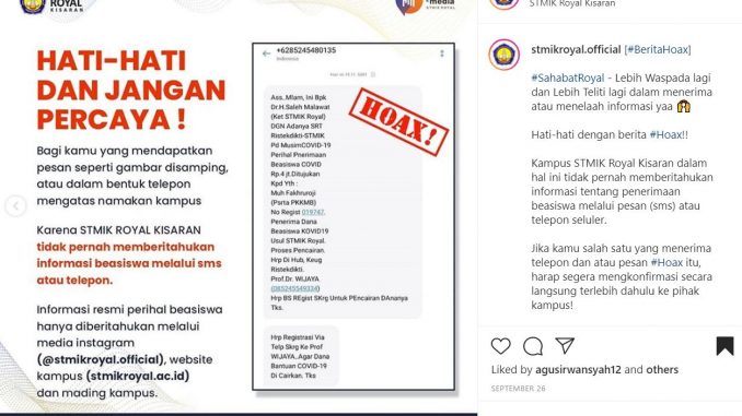 Informasi palsu. Melalui media sosialnya, STMIK Royal Kisaran menyatakan pesan tersebut adalah hoaks. Pihak kampus mengimbau agar selalu mengecek segala bentuk informasi di situs dan media sosial resmi.Selengkapnya terdapat di penjelasan!