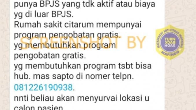 Beredar melalui broadcast WhatsApp tentang Rumah Sakit Citarum yang membuka program pengobatan gratis. Pesan tersebut berisi informasi bagi yang mempunyai saudara, tetangga, ataupun rekan yang sedang sakit dan tidak memiliki kartu BPJS maupun BPJS yang tidak aktif bahwa pada RS Citarum sedang ada program pengobatan gratis.