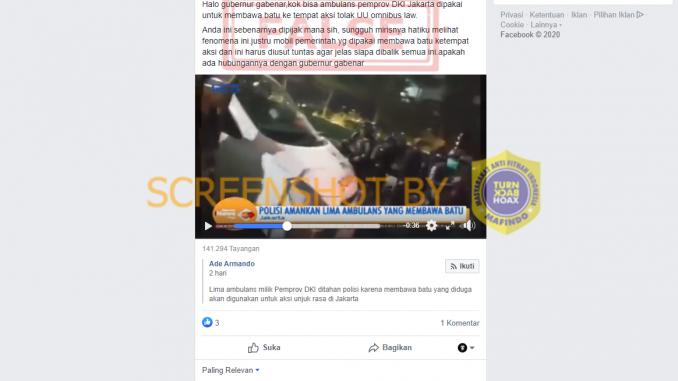 Akun Ade Armando hanya menulis narasi “Lima ambulans milik Pemprov DKI ditahan polisi karena membawa batu yang diduga akan digunakan untuk aksi unjuk rasa di Jakarta” tanpa menyertakan kapan peristiwa di video itu terjadi.