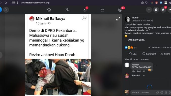 Beredar postingan dari akun Facebook Tauhid berupa sebuah tangkapan layar dengan keterangan seorang mahasiswa meninggal saat demo di DPRD Pekanbaru. Postingan ini disukai sebanyak 94 kali dan disebarkan kembali sebanyak 198 kali.