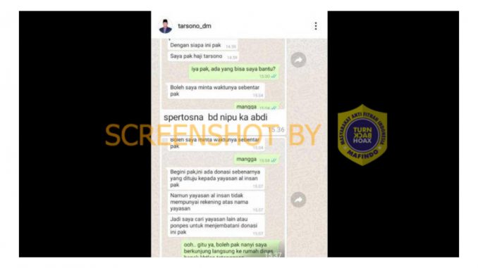 Beredar sebuah akun Whatsapp Wakil Bupati Majalengka Tarsono Dm menawarkan bantuan sosial (bansos). Pesan Whatsapp tersebut ditujukan kepada pondok pesantren dengan modus akan menjembatani bantuan sosial berupa donasi kepada pesantren.