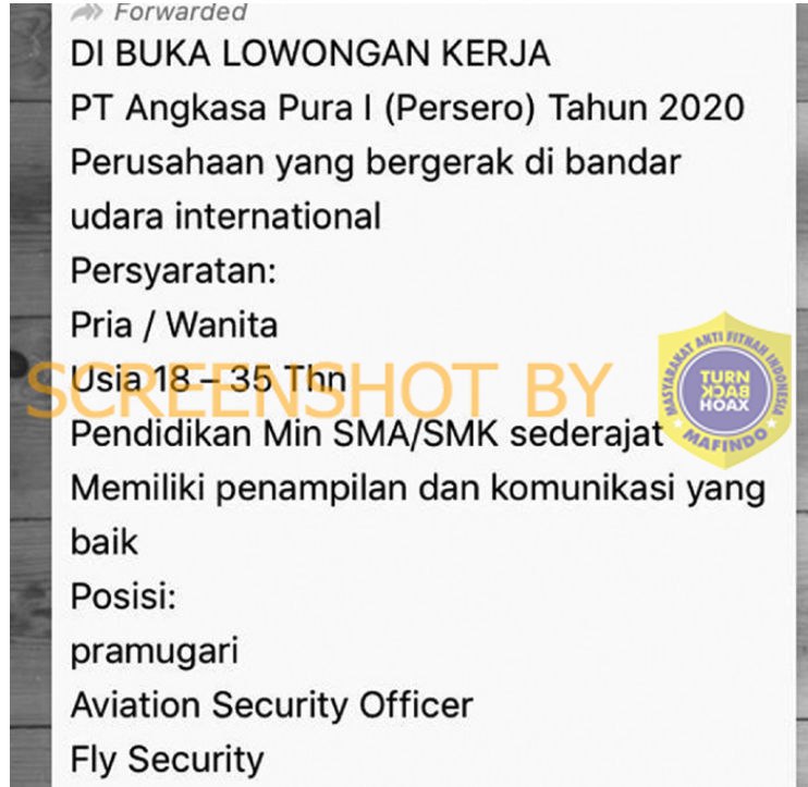 “Hoax itu, Nanti jika ada akan di umumkan di www.angkasapura2.co.id, sampai saat ini belum dibuka lowongan pekerjaan PT Angkasa Pura,” ujarnya saat dihubungi via whatsapp.