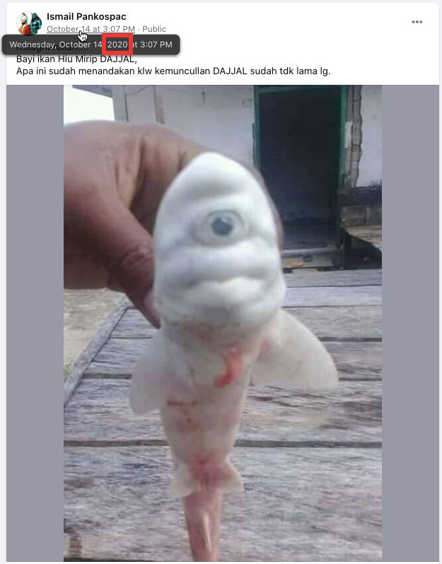 SUMBER menambahkan narasi yang salah ke foto bayi Ikan Hiu yang mengalami kelainan sangat langka yang disebut “Siklopia”, yang menyebabkan kesimpulan keliru karena menghubungkan ke hal lainnya.