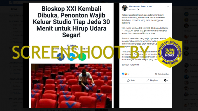 Beredar gambar tangkapan layar artikel berjudul “Bioskop XXI Kembali Dibuka, Penonton Wajib Keluar Studio Tiap Jeda 30 Menit untuk Hirup Udara Segar!” yang dimuat di situs hai.grid.id pada Senin, 19 Oktober 2020.