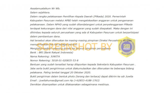 Setelah ditelusuri, surat permohonan tersebut salah. Bahkan Irsyad menegaskan bahwa surat permohonan dana tidak benar adanya dan tidak perlu ditindak lanjuti oleh pihak manapun. Dilansir dari website resmi Kabupaten Pasuruan di sela-sela kesibukannya pada Senin, 19/10/2020 Irsyad mengatakan.
