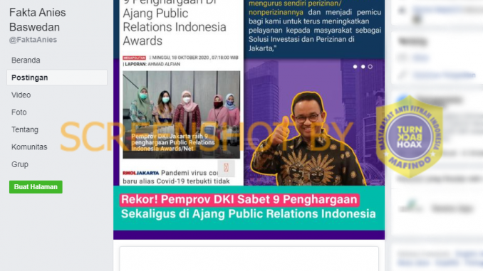 Dalam unggahannya, akun ini mengunggah sebuah gambar yang berisi tangkapan layar artikel di situs RMOL yang berjudul “DKI Cetak Rekor, Raih 9 Penghargaan Di Ajang Public Relations Awards”. Artikel tersebut terbit pada 18 Oktober 2020. Dalam gambar itu, terdapat pula foto Gubernur DKI Anies Baswedan serta kutipan yang berbunyi “Penghargaan ini kami persembahkan untuk seluruh warga Ibu Kota yang telah mengurus sendiri perizinan/nonperizinannya dan menjadi pemicu bagi kami untuk terus meningkatkan pelayanan kepada masyarakat sebagai Solusi Investasi dan Perizinan di Jakarta”.