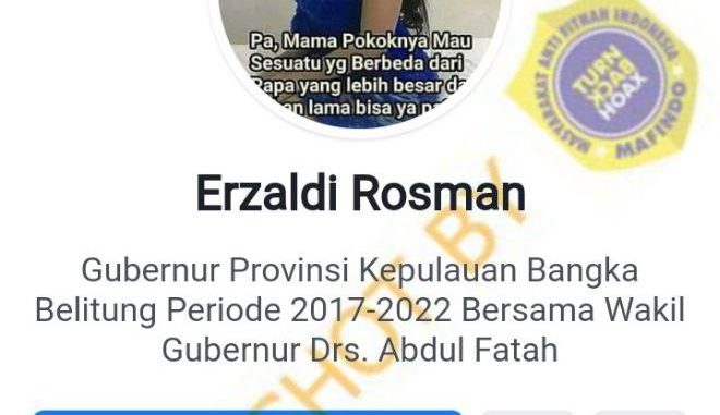 Beredar akun Facebook yang mengatasnamakan Gubernur Kepulauan Bangka Belitung Erzaldi Rosman. Akun dengan nama “Erzaldi Rosman” tersebut memposting hal-hal yang tidak sepantasnya dilakukan. Akun tersebut memiliki 4.456 pengikut.