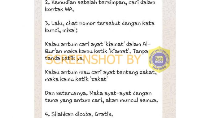 Quran Chat Me hanya sekedar mesin penjawab chatbot, yang tidak akan meminta user mencantumkan identitas pribadi. Dengan demikian akun Chatbot Whatsapp Quran Chat Me dengan isu pencurian data adalah tidak benar sehingga hal ini masuk dalam kategori konten palsu.