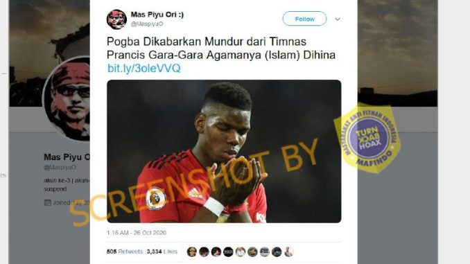 Akun Twitter @MaspiyuO membuat tweet disertai dengan gambar pada tanggal 26 Oktober 2020 pukul 01.16. Postingan tersebut mendapat Likes sebanyak 3.334 kali, 505 Retweets dan 88 Reply. Cuitan di akunnya mengatakan bahwa Paul Pogba salah satu pesepak bola dari Timnas Perancis menyatakan mundur karena agamanya dihina. Klaim Akun @MaspiyuO, berasal dari sumber berita yakni portal-islam.id dengan judul “Pogba Dikabarkan Mundur dari Timnas Perancis Gara-Gara Agamanya (Islam) Dihina”.