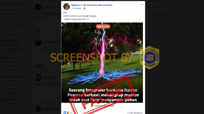 Dilansir dari Tempo.co, Tim CekFakta Tempo menelusuri jejak digital foto tersebut dengan reverse image tool Google dan TinEye. Hasilnya, ditemukan bahwa foto itu bukan foto yang diabadikan saat petir menyambar pohon tersebut, melainkan gabungan dari dua foto berbeda dan ditambah efek cahaya.