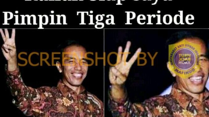 Beredar di grup Kita Bersama Jokowi 3 Periode akun Facebook atas nama Angel Nabila mengunggah foto Presiden Jokowi dengan klaim Jokowi siap memimpin tiga periode. Postingan ini di unggah pada 29 Oktober 2020 kemudian sudah disukai sebanyak 825 kali, dikomentari 329 kali dan dibagikan sebanyak 54 kali.
