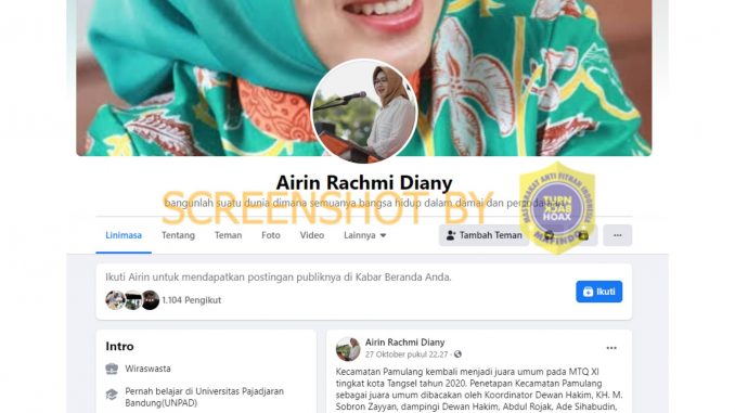 “Terkait dengan munculnya akun Facebook atas nama Wali Kota Tangerang Selatan, Airin Rachmi Diany yang digunakan oleh orang yang tidak bertanggung jawab untuk melancarkan aksi penipuan. Bahwa akun Facebook tersebut palsu. Dikarenakan Wali Kota Tangsel tidak memiliki akun resmi di Facebook” dikonfirmasi pada Rabu (28/10/20).