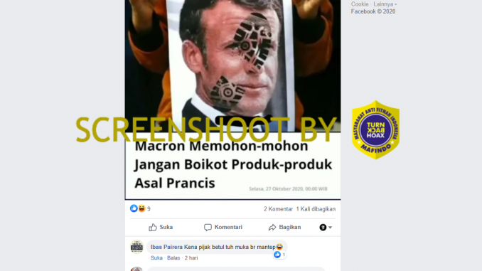 Akun Mutiara Alfath (fb.com/priatna.1933) mengunggah gambar Presiden Prancis Emmanuel Macron. Di gambar itu juga terdapat narasi “Macron Memohon-mohon Jangan Boikot Produk-produk Asal Prancis”