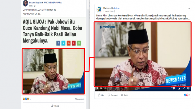 Informasi tersebut tidak benar. Ditemukan gambar identik pada cuplikan tayangan program Newsmaker Medcom.id yang diunggah akun resmi media sosial Medcom.id, di antaranya di akun Facebook dan akun Youtube Medcom.id pada 7 Maret 2019. Pembahasan dalam episode tersebut adalah larangan memanggil kafir bagi Non-Muslim. Dari tayangan itu, Said Aqil Siradj sama sekali tidak menyebut bahwa Jokowi merupakan cucu Nabi Musa.