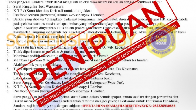 Informasi tersebut palsu. Faktanya, PT Pertamina tidak mengeluarkan surat perihal Panggilan Tes Calon Karyawan tertanggal 16 Oktober 2020 dan info resmi hanya melalui recruitment.pertamina.com.