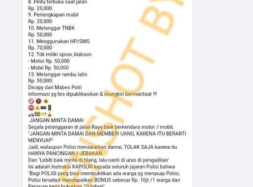 Salah satu akun media sosial Facebook menyebarkan infomasi biaya denda tilang selama Operasi Zebra Semeru 2020 yang diklaim dikeluarkan oleh Mabes Polri. Dalam postingannya, disebutkan setidaknya ada 13 rincian biaya pelanggaran.