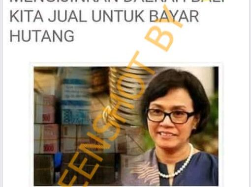 Dari hasil penelusuran, berita tersebut pernah beredar di tahun 2017 dan 2018, namun berita tersebut telah dibantah langsung oleh Sri Mulyani melalui akun media sosialnya, Sri mengatakan bahwa pemerintah menjual daerah Bali untuk bayar utang adalah fitnah keji dan tidak benar.