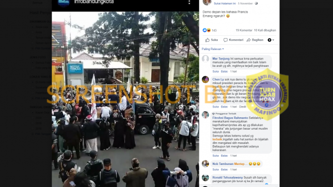 Dilansir dari IDN Times, massa yang mengatasnamakan Aliansi Umat Islam se-Bandung Raya, menyegel Institut Francais Indonesia (IFI) Jalan Purnawarman, Kota Bandung, Senin (2/11/2020).