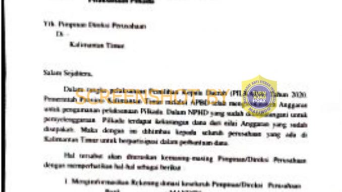 Berdasarkan penelusuran, surat tersebut PALSU dan tidak benar dikeluarkan oleh Gubernur Provinsi Kalimantan Timur. Melansir dari nomorsatukaltim.com Gubernur Provinsi Kalimantan Timur, Isran Noor, ketika dikonfirmasi melalui Kepala Biro Hubungan Masyarakat (Humas) Sekretariat Daerah Provinsi (Setdaprov) Kaltim, Syafranuddin menegaskan bahwa Gubernur tidak pernah menerbitkan surat untuk meminta partisipasi anggaran dari Perusahaan untuk pelaksanaan pilkada serentak 2020.