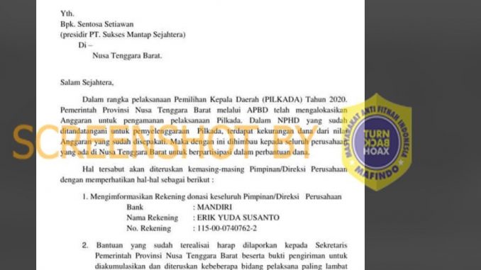 Beredar sebuah surat edaran melalui Whatsapp dengan mencatut nama Gubernur Nusa Tenggara Barat (NTB) yang meminta bantuan dana pengamanan pelaksanaan Pilkada 2020.
