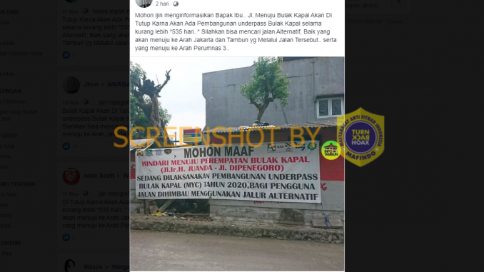 Berdasarkan hasil penelusuran, klaim bahwa jalan menuju Bulak Kapal, Bekasi Timur akan ditutup selama 535 hari karena pembangunan underpass adalah klaim yang salah.