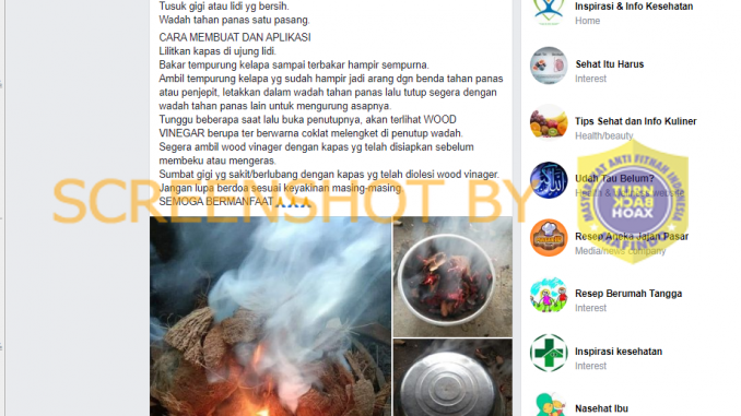 Akun Facebook Topik Kesehatan mengunggah narasi berisi informasi tata cara mengolah tempurung kelapa untuk dijadikan obat sakit gigi berlubang pada 17 November 2020. Dalam narasi tersebut, dijelaskan bahwa tempurung kelapa terlebih dahulu dibakar, kemudian tutup segera dengan wadah tahan panas untuk mengurung asapnya. Tunggu beberapa saat, lalu buka penutupnya dan akan terlihat wood vinegar cuka kayu berupa ter berwarna coklat melengket di penutup wadah. Kemudian oleskan wood vinegar ke gigi berlubang.