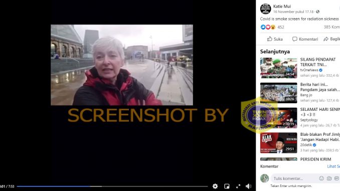 Sebuah akun Facebook bernama Katie Mui mengunggah video berdurasi 7 menit 53 detik yang memperlihatkan seorang wanita di jalan yang sedang berbicara mengenai Corona yang merupakan sebuah kedok dari penyakit radiasi.