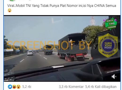Akun Facebook Berita Viral Terbaru membagikan sebuah video dengan durasi tiga menit pada video tersebut diklaim bahwa mobil TNI tanpa nomor polisi mengangkut orang China, pada Jumat (20/11/20).