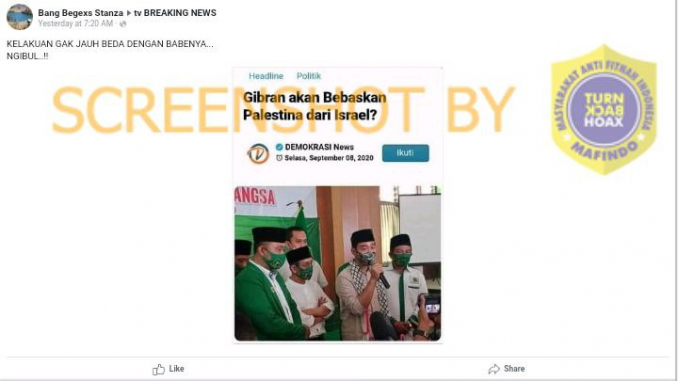 Beredar di Facebook akun dengan nama Bang Begexs Stanza memposting sebuah tangkapan layar yang diambil dari DEMOKRASI News tertanggal Selasa, 8 September 2020 dengan judul “Gibran akan Bebaskan Palestina dari Israel? “.