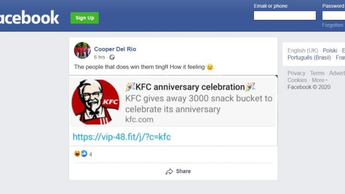Beredar postingan dari akun Facebook Cooper Del Rio berupa tangkapan layar sebuah link dengan keterangan bahwa KFC memberikan 3000 snack bucket gratis untuk merayakan ulang tahunnya. Postingan ini disukai sebanyak 7 kali.