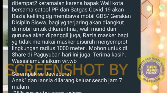 Telah beredar kembali pesan di WhatsApp yang menginformasikan bahwa akan ada razia keliling yang dilakukan Wali Kota bersama dengan Satpol PP dan Satgas Covid-19 serempak se-Jawa Barat mulai malam ini. Terdapat beberapa sanksi yang akan diberikan kepada orang-orang yang melanggar dalam razia tersebut.