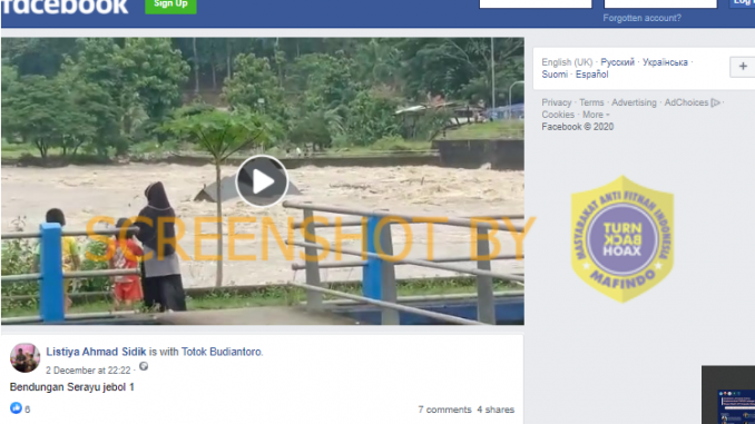 Akun Facebook bernama Listiya Ahmad Sidik dan Dian Kelana Wisesa mengunggah status pada 2 Desember 2020 berupa video amatir yang menampilkan sebuah objek yang hanyut oleh derasnya aliran air di bendungan Gerak Serayu, Banyumas Jawa Tengah. Dalam video seorang pria mengatakan objek tersebut adalah bagian dari bendungan yang terbawa aliran air. Beberapa informasi lain menyebutkan benda tersebut merupakan salah satu pintu bendungan yang jebol.