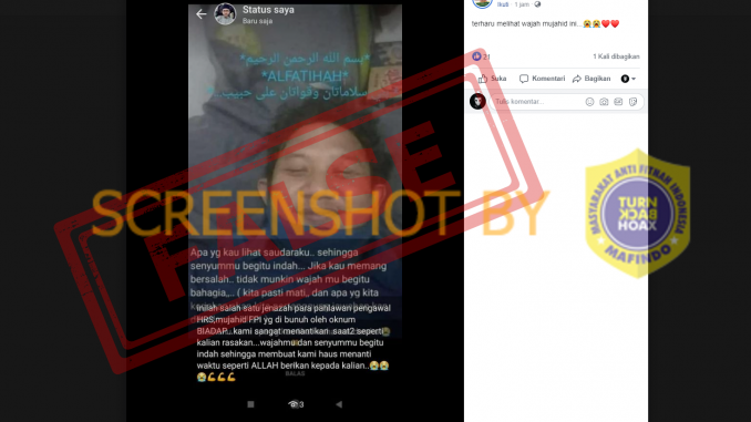 Juga terdapat narasi “inilah salah satu jenazah para pahlawan pengawal HRS,mujahid FPI yg di bunuh oleh oknum BIADAP. kami sangat menantikan saat2 seperti kalian rasakan. wajahmu dan senyummu begitu indah sehingga membuat kami sehingga membuat kami haus menanti waktu seperti ALLAH berikan kepada kalian”