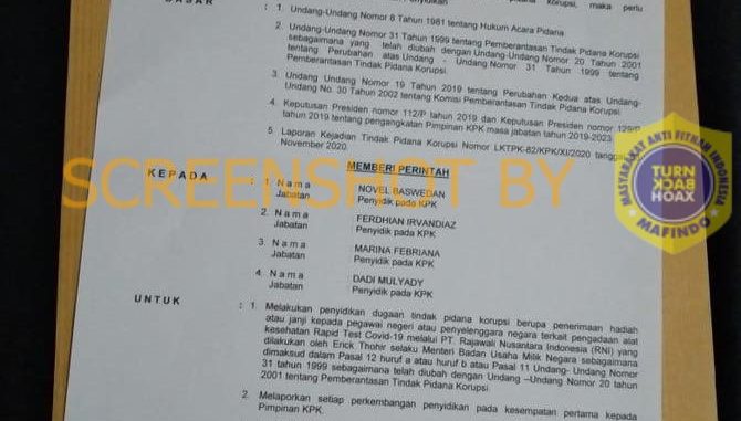 Berdasarkan hasil penelusuran, mengutip dari Kompas, Ketua KPK Firli Bahuri menyatakan, surat perintah penyidikan (sprindik) tersebut merupakan informasi bohong alias hoaks dan KPK tidak pernah mengeluarkan sprindik terkait penyidikan pengadaan alat kesehatan Rapid Test.