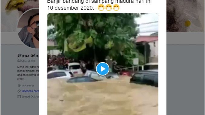 Beredar sebuah postingan dari akun Facebook Hoss Markito berupa video banjir bandang yang menyeret beberapa mobil dengan keterangan bahwa banjir bandang tersebut terjadi di Sampang, Madura pada 10 Desember 2020. Video ini berdurasi 26 detik dan telah ditonton sebanyak 146 kali.