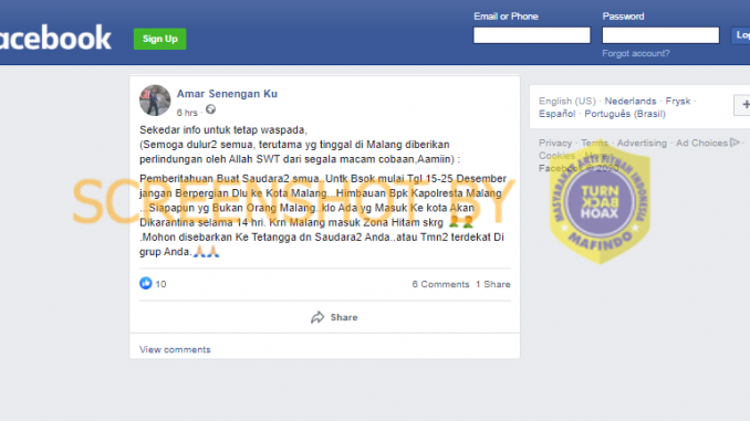 Akun Facebook bernama Amar Senengan Ku mengunggah status pada tanggal 13 Desember 2020 berupa informasi yang menyebut Malang masuk zona hitam Covid-19 dan imbauan Kapoltes Malang, warga luar yang berkunjung akan dikarantina selama 14 hari. Pesan tersebut juga menyebar melalui pesan berantai di WhatsApp.
