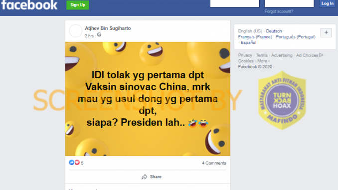 Beredar informasi yang menyebut Ikatan Dokter Indonesia (IDI) menolak untuk disuntik vaksin Covid-19 pertama kali. Informasi serupa beredar di Facebook, WhatsApp dan media sosial lainnya.