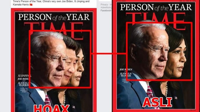 Akun Facebook bernama George A Peterson membagikan postingan berupa gambar cover majalah Time. Dalam cover majalah tersebut memperlihatkan Joe Biden, Kalama Harris dan Xi Jinping, ketiganya memperoleh gelar ‘Person of The Year’ oleh majalah Time. Postingan yang mendapat 56 likes dan dibagikan 45 kali adalah hasil gambar editan dari cover aslinya.