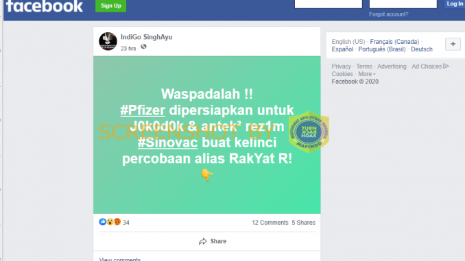 Akun Facebook IndiGo SinghAyu memposting sebuah status dengan klaim narasi bahwa vaksin Pfizer dipersiapkan untuk Presiden Joko Widodo beserta jajarannya sedangkan vaksin Sinovac dipersiapkan untuk masyarakat sebagai kelinci percobaan. Postingan yang diunggah pada 16 Desember 2020 ini telah mendapatkan sebanyak 13 komentar dan telah dibagikan sebanyak 6 kali oleh pengguna Facebook lain.