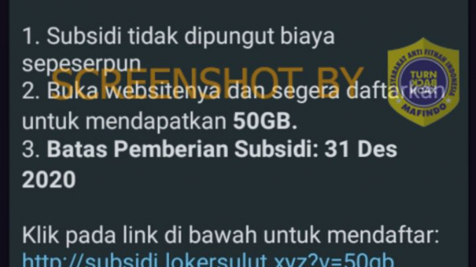 Beredar di Whatsapp informasi bahwa operator memberikan kuota internet gratis sebesar 50 GB jika mendaftar dalam sebuah link. Dalam narasi tersebut mengklaim informasi itu merupakan gelombang kedua pembagian kuota internet dengan batas waktu hingga 31 Desember 2020.