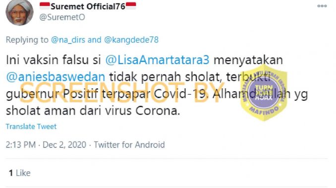 Sebuah akun Twitter bernama @SuremetO membalas cuitan yang membantah bahwa wudhu dapat mencegah dari Covid-19 dengan menjelaskan mengenai fungsi wudhu yang untuk membersihkan hadats kecil dan besar. Bukan membersihkan virus. Lalu @SuremetO membantah lagi dengan memaparkan bukti lain bahwa Anies Baswedan tidak pernah sholat, oleh karena itu Anies terpapar virus Corona, @SuremetO mengatakan bahwa orang yang sholat aman dari virus Corona.