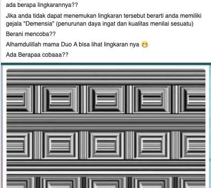 Akun Dwina Permata Sari membagikan sebuah gambar ilusi optik di linimasa pribadinya di Facebook pada tanggal 14 Desember 2020 pukul 09.35 WIB. Gambar tersebut diberi keterangan yang isinya kurang lebih adalah bahwa gambar tersebut merupakan rancangan Anthony Norcia dari Amerika Serikat, yang sekilas terlihat berupa garis dan kotak namun terdapat lingkaran juga. Akun Dwina Permata Sari menuliskan bahwa apabila seseorang tidak dapat menemukan lingkaran yang terdapat pada gambar tersebut, maka seseorang itu memiliki gejala demensia, penurunan daya ingat dan kualitas menilai sesuatu.