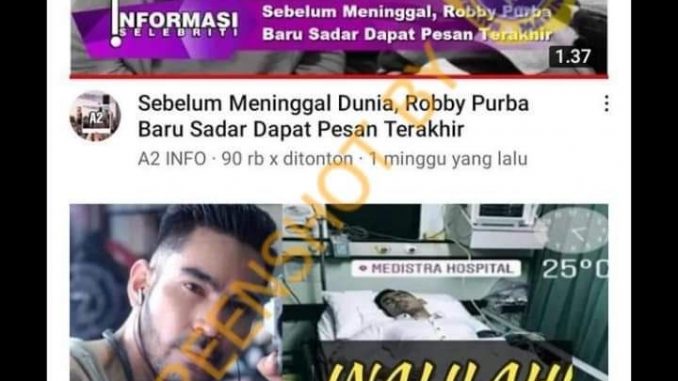 Sebuah hasil tangkapan layar menampilkan dua video dengan judul yang memperlihatkan bahwa salah satu prensenter ternama Indonesia, Robby Purba, telah meninggal dunia. Akun Youtube yang bernama A2 INFO dan zonyot channel ini, mengunggah video dengan tampilan depan yang memperlihatkan foto Robby Purba bersama seorang wanita dengan diedit hitam putih, dan foto Robby Purba yang sedang terbaring di Rumah Sakit. Salah satu video itu tersebut pun telah ditonton hingga 450ribu kali.