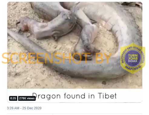 Beredar video di media sosial yang menunjukan rekaman penemuan naga mati dengan klaim berada di Tibet. Beberapa versi lain menyebutkan penemuan ‘naga’ ini jatuh dari langit Filipina.